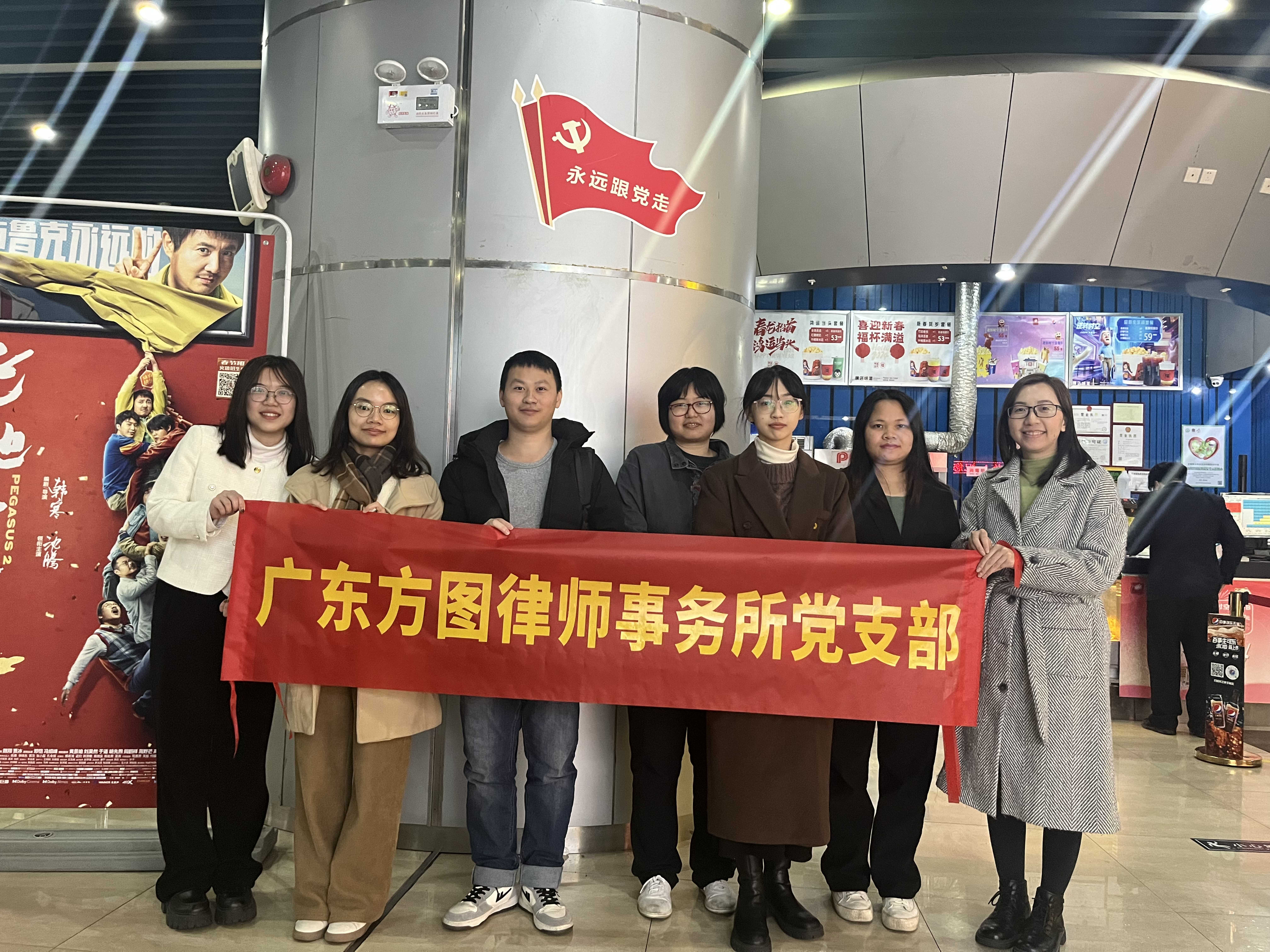 为进一步深入学习贯彻习近平法治思想,弘扬社会主义法治精神,深化法治观念,广东方图律师事务所党支部于2024年3月4日,组织各党员及所内同事一同前往电影院观看普法电影《第二十条》。