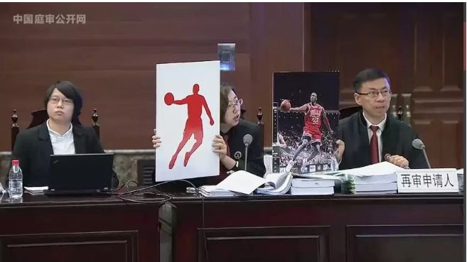 这张图片太有名了,请允许我再用一下这个素材。我在此前的《道方图说 | 律师如何可视化表达庭审观点?》一文中用过这张图片。庭审现场中,出现非常精彩的一幕。再审申请人代理律师现场将第三人乔丹体育注册的形象商标与迈克尔·乔丹先生在1997年12月10日NBA常规赛的上篮瞬间。